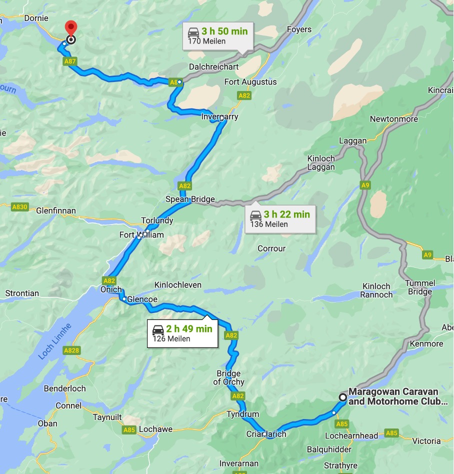 Nach Fort William geht es dann weiter nach Norden, immer am Great Glen, der ja be Fort William seinen Ausgang nimmt, entlang Richtung Loch Ness, den ich aber nicht ansteuere. Bei Spean Bridge geht es dnan nach links und am Ostufer des Loch Lochy weiter zum Loch Oich, wo es bei Invergarry in Richtung Westen weiter geht. Je nach Lust, Laune und Wetter mal kurz am Glen Garry Viewpoint halten und dann immer schön durch die Highlands nach westen bis zum Loch Duich wo es dann etwas nach Norden zum Morvich Campingplatz geht