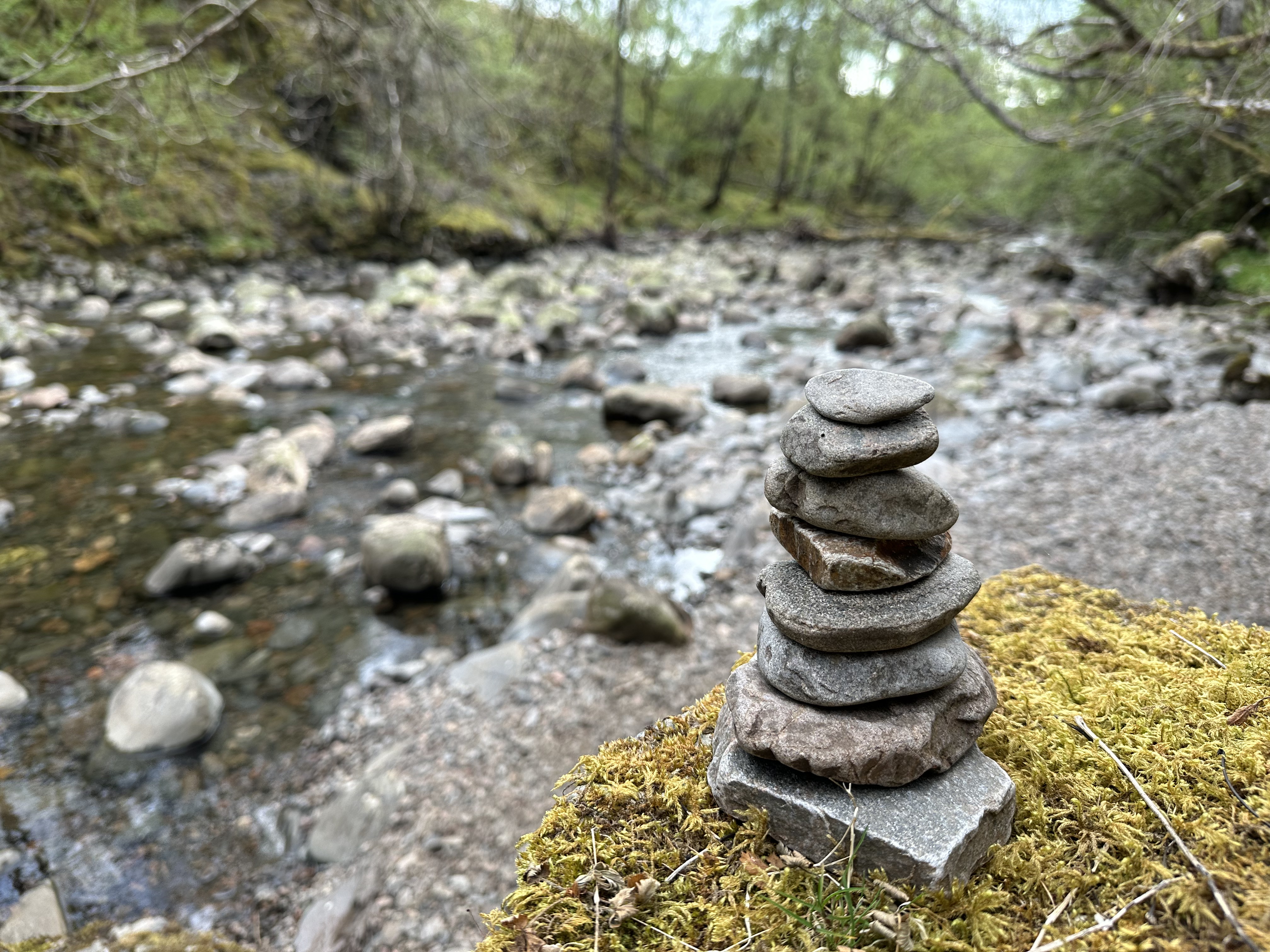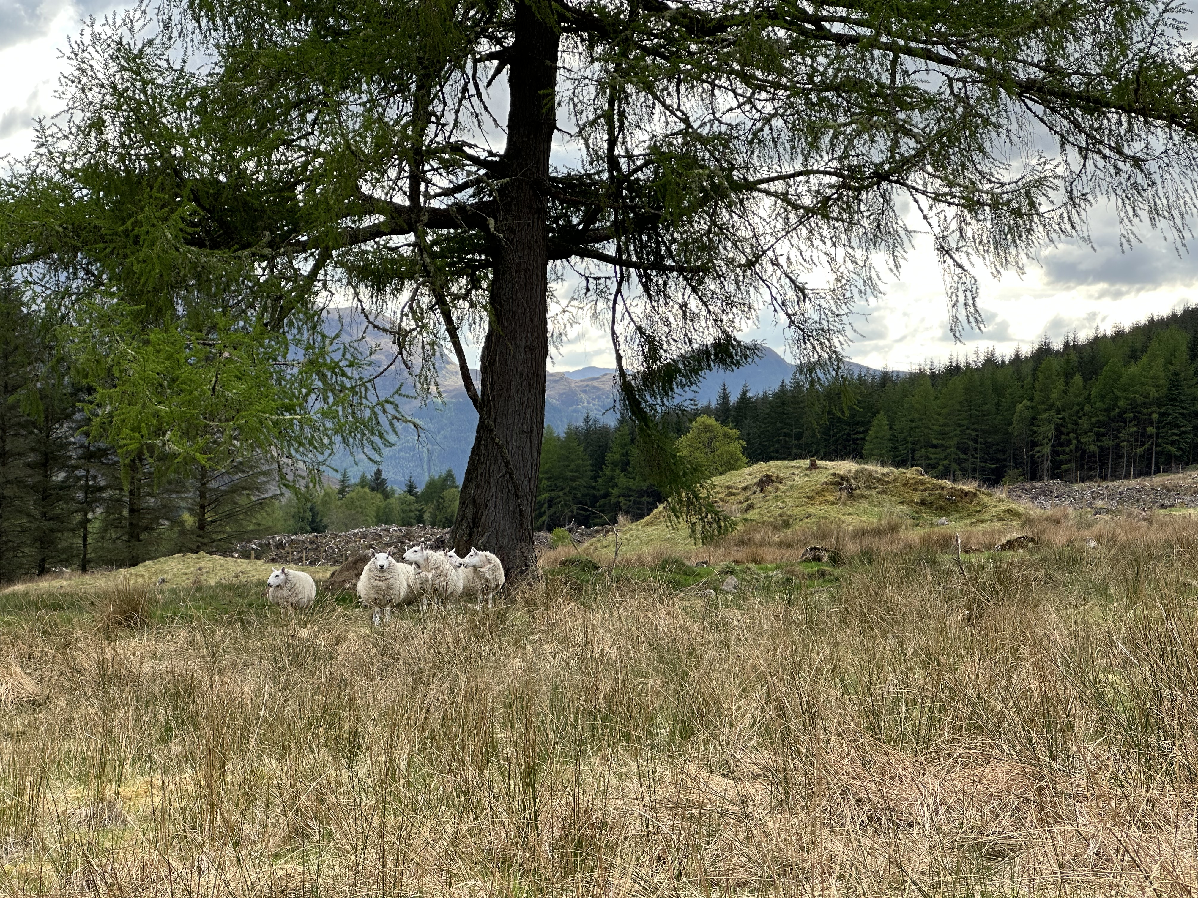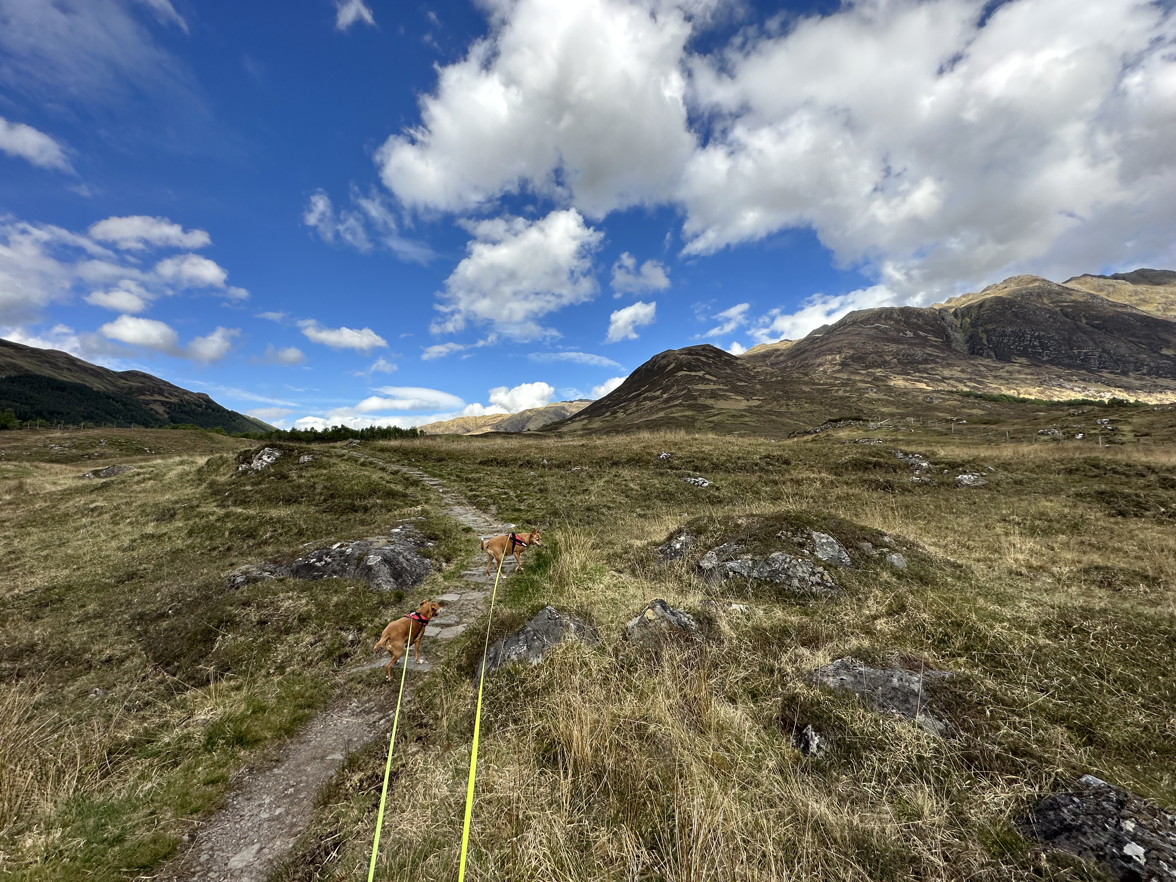 Das Wetter war so gut, dass Momo und Nana direkt mal vor dem funThom zur Ruhe kamen und ich dann ebenfalls Campingstuhl und Tisch aufbaute und draußen meinen Kaffee (löslich aber trinkbar) mit einem Stück Apfelkuchen zu mir nahm. Da kann man schon die Zeit verlieren und ich ertappte mich bei dem Gedanken, dass ich doch den Rest des Tages einfach rumgammeln könnte. Glüklicherweise kam ich recht schnell zur Besinnung. Man weiß ja nie wie lange man gutes Wetter in Schottland genießen darf, also sollte man das anders nutzen als faul rumzuhängen und Kaffe zu saufen (mit Kuchen versteht sich). Also ab in die Wanderschuhe und los. Eine gute Wahl, die Tour war etwas länger als 8 km und das tat allen 10 Beinen gut.
