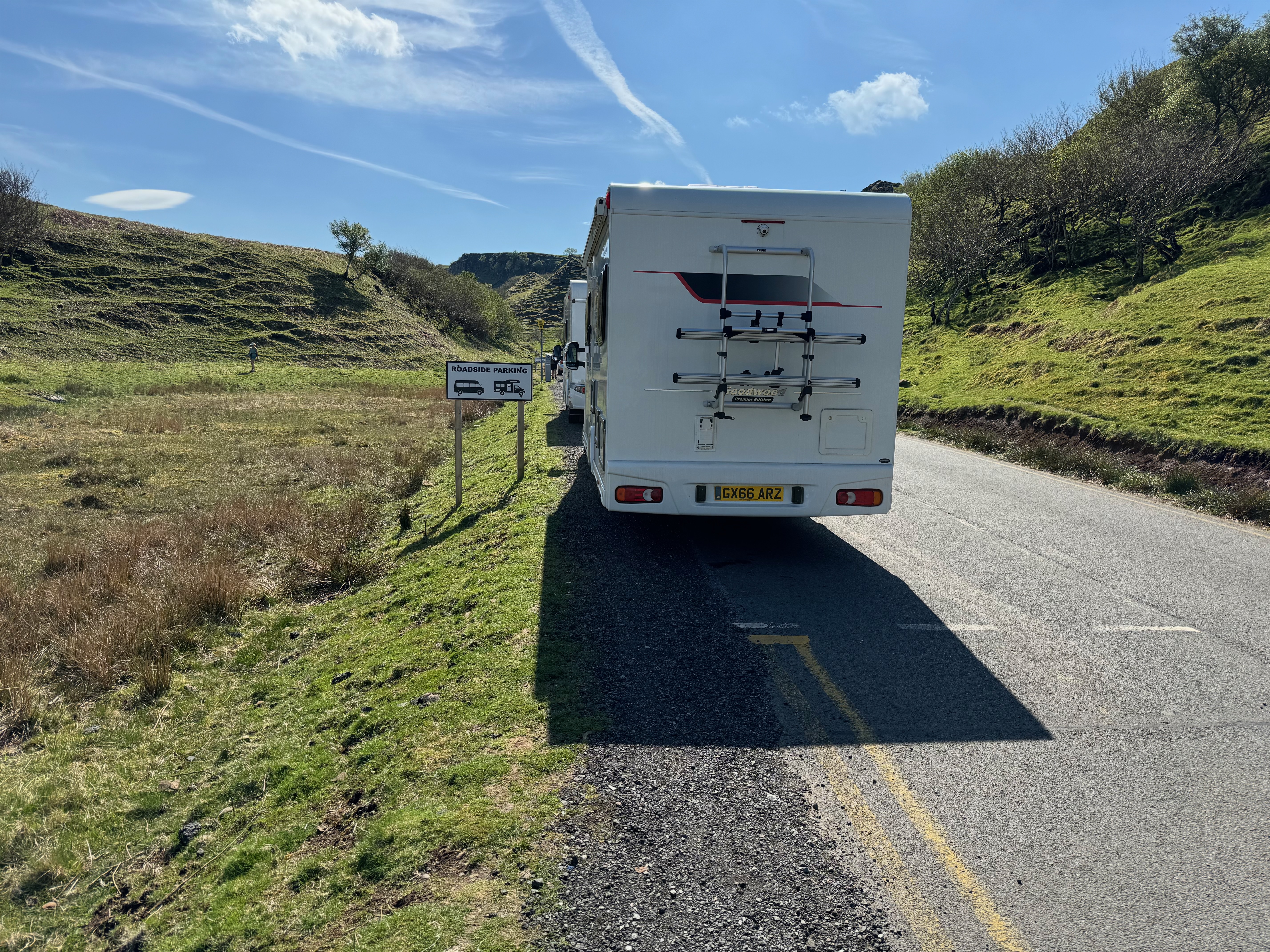 Noch ein wichtiger Hinweis: Wenn man mit dem Wohnmobil auf den ausgewiesenen Parkplätzen parkt, darf man nicht zu weit links stehen. Sprich, haltet euch vom Schotter fern, da dieser als fußweg gilt und dort scheinbar gerne ein Sheriff unterwegs ist, der dieses als Blockieren des Fußwegs mit einem Strafzettel belegt. Kosten: 100 Pfund, 50, wenn man innerhalb von 2 Wochen zahlt. Also "roadside parking" heißt nicht am Straßenrand, sondern auf der Straße parken...