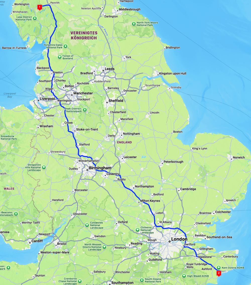 Der letzte große Abschnitt in Großbritannien. Aus dem Lake District bis an die Südküste der britischen Insel. Knapp 600 km nach Süden für eine letzte Nacht auf der Insel. Dort wo wir die erste Nacht verbracht haben wird dann auch die letzte Nacht sein. Daleacres hat den unschätzbaren Vorteil, dass der Platz nur rund 15 km vom TUnnel entfernt ist, so dass man auch eine frühe Passage buchen und dann in aller Ruhe auf dem Kontinent die Heimreise erledigen kann.