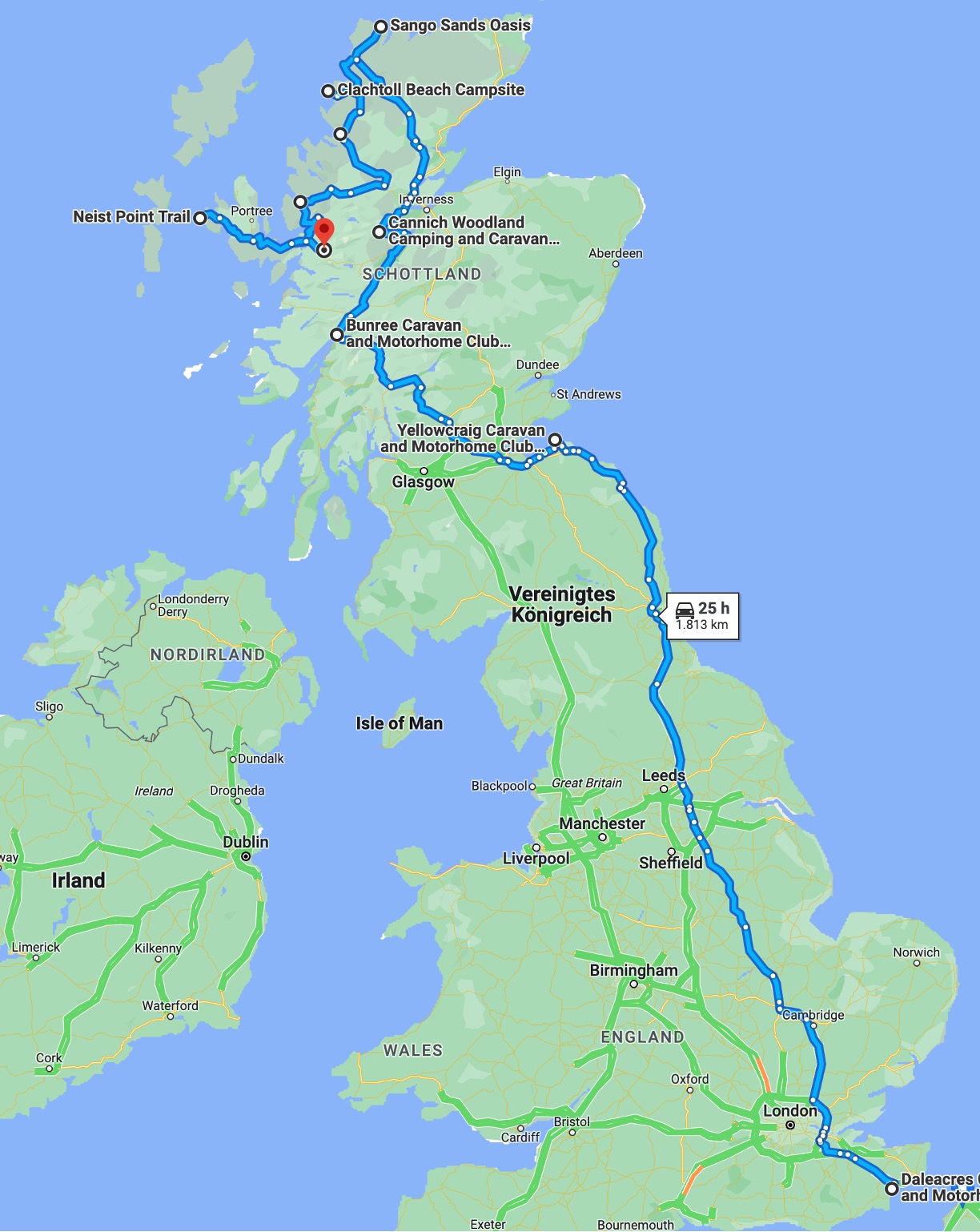 Der zweite Teil der Route zeigt den Weg zurück aus Schottland bis zum Tunnel. Die letzte Übernachtung auf der Insel wird wie die erste in Daleacres stattfinden. Der Platz liegt einfach zu günstig für den Tunnel und die Rückpassage soll sehr früh am Morgen sein.