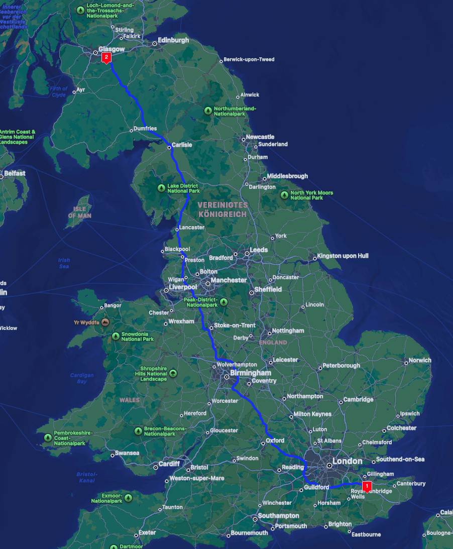 Am nächsten Morgen geht es dann weiter. Da wir ja noch im Süden Großbritanniens sind, südlicher geht’s kaum, heißt es auch am zweiten Tag noch einmal: Kilometer schrubben. Von Bearsted bis szum Strathclyde Campingplatz sind es mehr als 700 km, aber eine solche Strecke hatte ich in 2024 auch und das war kein Problem. Großer Pluspunkt: Fast ausschließlich Motorway!